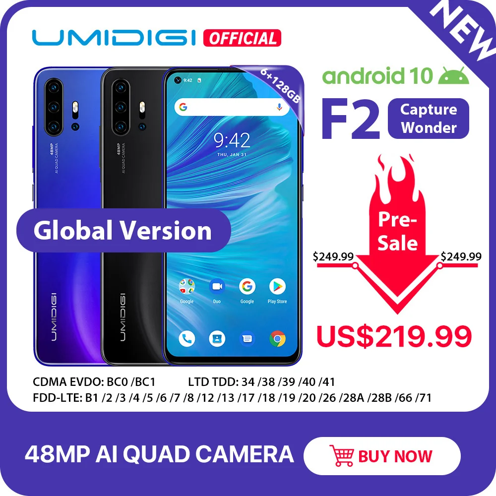 Best Product IN STOCK UMIDIGI F2 Android 10 Global Version 6.53"FHD+6GB 128GB 48MP AI Quad Camera 32MP Selfie He