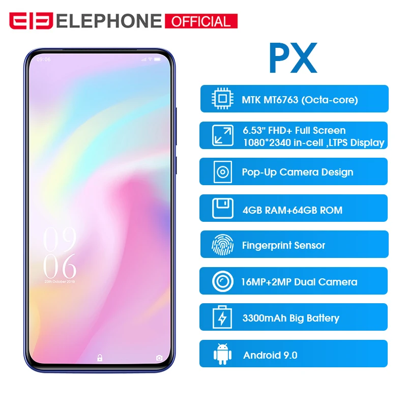 Elephone PX 6.53" FHD+Full Screen Pop-Up 16MP+2MP Camera 3300mAh Mobile Phone Android 9.0 MT6763 Octa Core 4GB+64GB Smartphone :Click Here